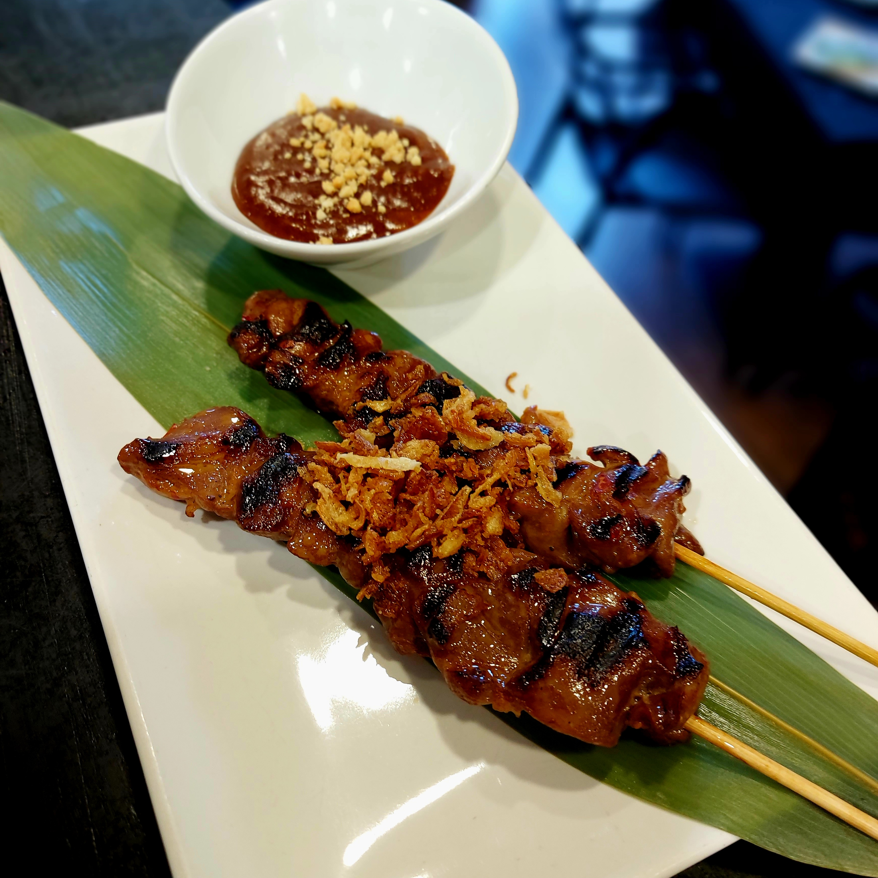 Satay de pollo, brocheta de pollo marinado y asado servido con salsa de cacahuete